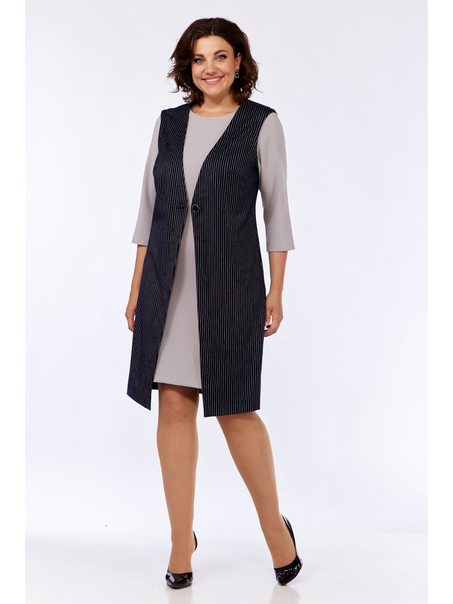 Оформить заказ →Платье женское, полуприлегащего силуэта, из текстильного материала. Имитация платья с удлиненным жилетом. Перед платья с нагрудными вытачками, круглым вырезом горловины, втачными, одношовными рукавами длиной 3/4. Детали переда жилета с v- образным вырезом горловины, нагрудными вытачками, застежкой на петлю и пуговицу. Спинка с талиевыми вытачками и средним швом, в верхней части которого обработана потайная застежка на тесьму - "молнию".