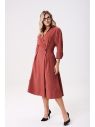 Элегантное женское платье из костюмной ткани необычного кроя станет изюминкой вашего гардероба. Платье полуприлегающего силуэта, отрезное по линии талии со спущенным плечом. Рукав 3/4 длинный на отрезной манжете. По полочке идут защипы-складки в верхней и нижней частях, запах - на петли и пуговицы по подрезу. По нижней части платья запах идет в виде складки. По спинке кокетка со складкой, по подрезу вставлена резинка. Юбка-полусолнце с односторонними складками по полочке, по бокам карманы. По горловине воротник на отрезной стойке. Платье будет идеально смотреться с туфлями, ботинками и сапогами.