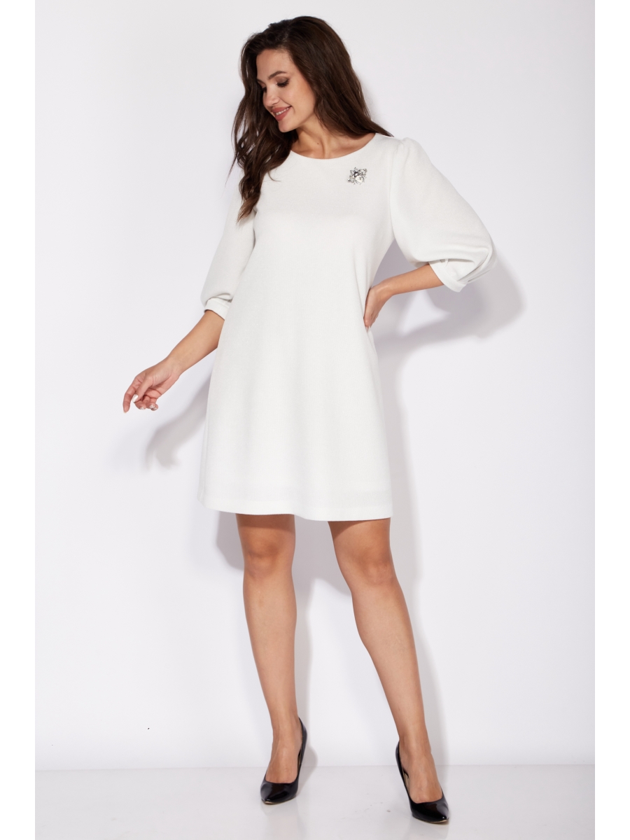 Платье женское, А-образного силуэта. Рукав втачной, длиной 3/4 фантазийной формы. Сверху рукав со сборкой. Снизу притачная манжета и мягкие складки. Вырез горловины круглой формы. Декором служит съемная брошь. Платье на трикотажной подкладке. Спинка без особенностей.