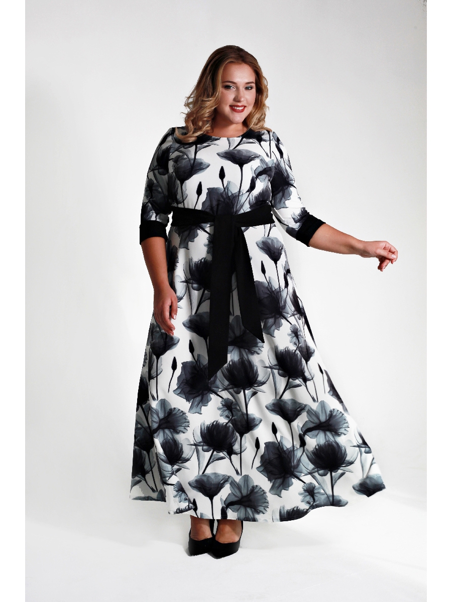 Романтичное длинное платье из крепа с эластаном. Принт - серо-черные цветы на белом фоне. Отрезное по линии талии, юбка расклешенная, манжеты и пояс черного цвета. Пояс в комплекте.