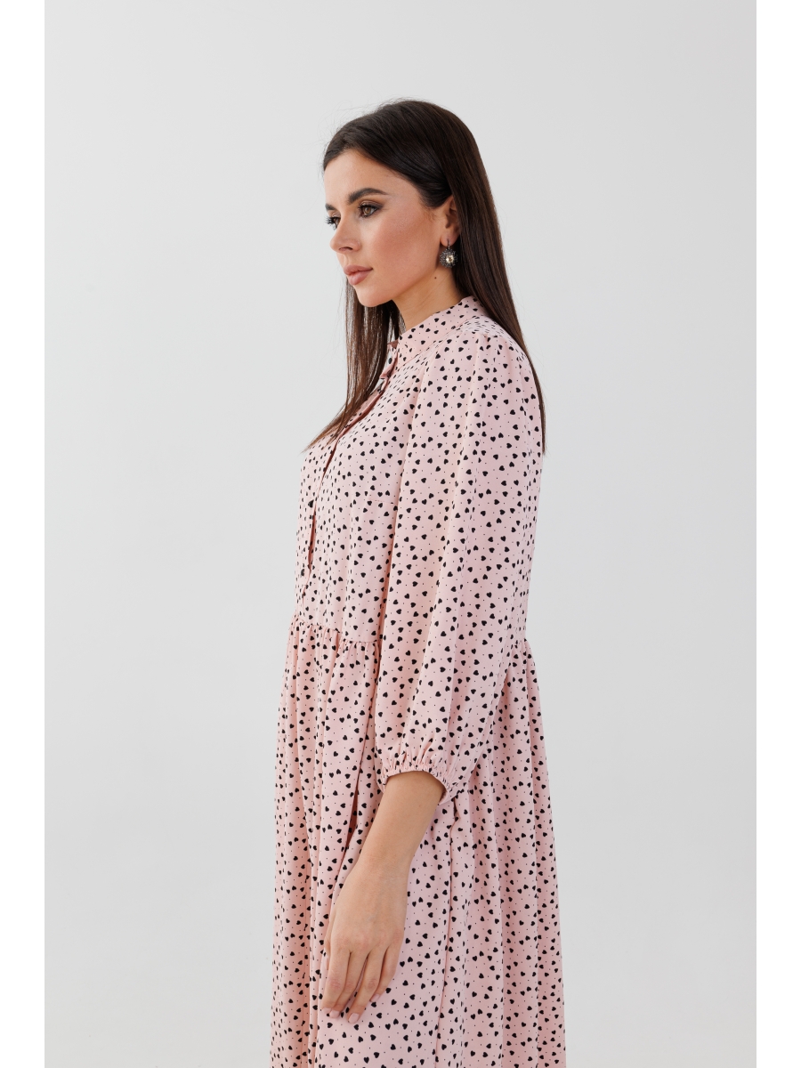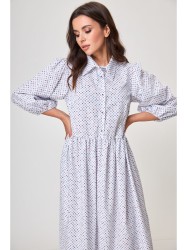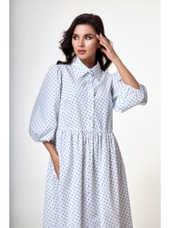 Длина по переду ниже колена, по спинке чуть длиннее. Рукав 3/4, на резинке. Классический рубашечный воротник и застежка на петли пуговицы по переду до линии талии. Платье отрезное по линии талии со сборкой по юбке. Карманы в боковых швах.