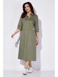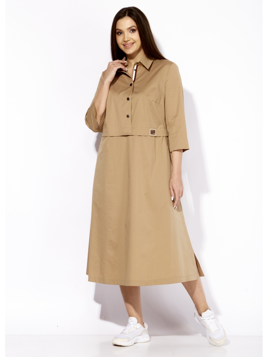 Оформить заказ →Платье женское, расширенное к низу, отрезное по талии. Рукав втачной, длиной 3/4, по низу с разрезом на локтевом шве. По переду нагрудные вытачки. Воротник рубашечный на отрезной стойке. Застежка лифа платья центральная, на кнопки. Внутренняя планка акцентирована отделочной тесьмой. Спинка со средним швом. По низу лифа отлетная складка. Нижняя часть платья (юбка) расширенная, с карманами и разрезами по бокам.