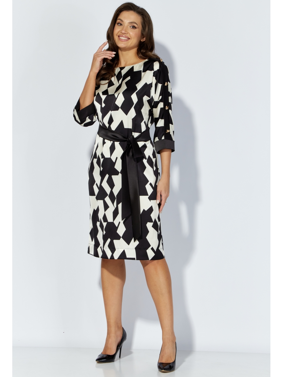 Платье женское, прямого силуэта с цельнокройным рукавом длинной 3/4. По низу рукава притачная манжета. Слева, в шве рукава, отлетная планка, закрепленная на петли и отделочные пуговицы. Вырез горловины круглой формы. Сзади средний шов и застежка на потайную "молнию". Талию подчеркивает съемный пояс.