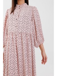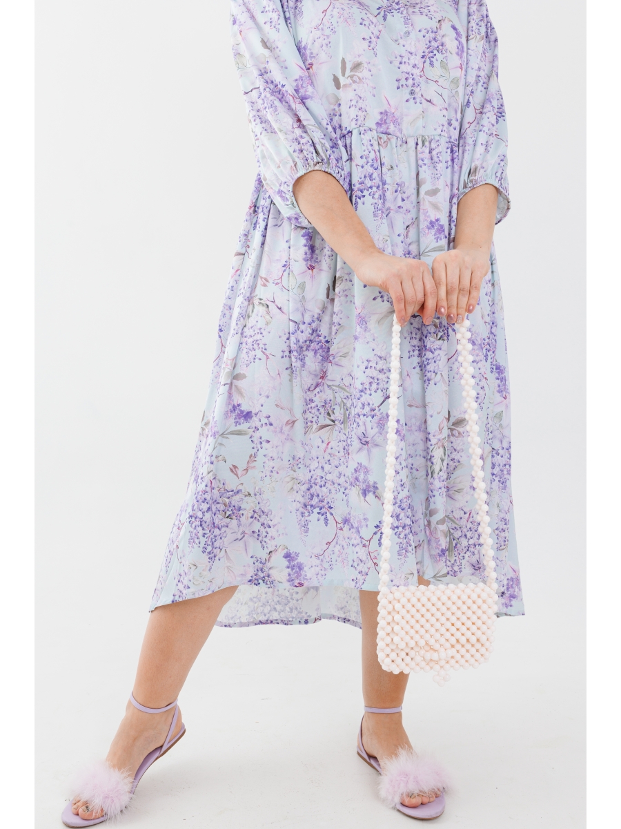 Платье женское, оверсайз силуэта, длина ниже колена по переду, спинка длиннее. Рукав втачной со сборкой по окату, низ на резинке, длина 3/4. Горловина обработана стойкой. По переду нагрудные вытачки и планка на петли пуговицы до линии талии. Платье отрезное по линии талии, юбка на сборке. Платье актуально, как для ежедневной носки, так и для романтических вечеров.