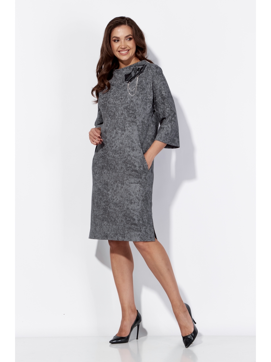 Платье женское, прямого силуэта с цельнокроеным рукавом, длиной 3/4. По переду и спинке фигурные рельефы. По переду карманы в рельефах с отделочной отстрочкой. По низу, в боковых швах, разрезы. Горловина оформлена небольшой, мягкой, цельнокройной строчкой.