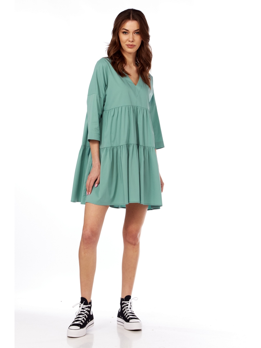 Оформить заказ →Платье женское, свободного силуэта, выполнено из хлопкового полотна. Горловина V-образной формы. Передняя и задняя часть с двумя отрезами и мелкой сборкой по всему изделию. Плечо спущенное.
