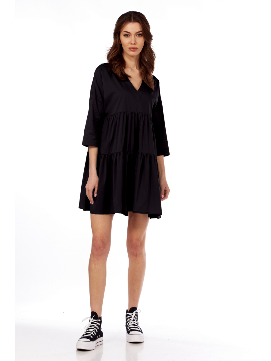Платье женское, свободного силуэта, выполнено из хлопкового полотна. Горловина V-образной формы. Передняя и задняя часть с двумя отрезами и мелкой сборкой по всему изделию. Плечо спущенное.