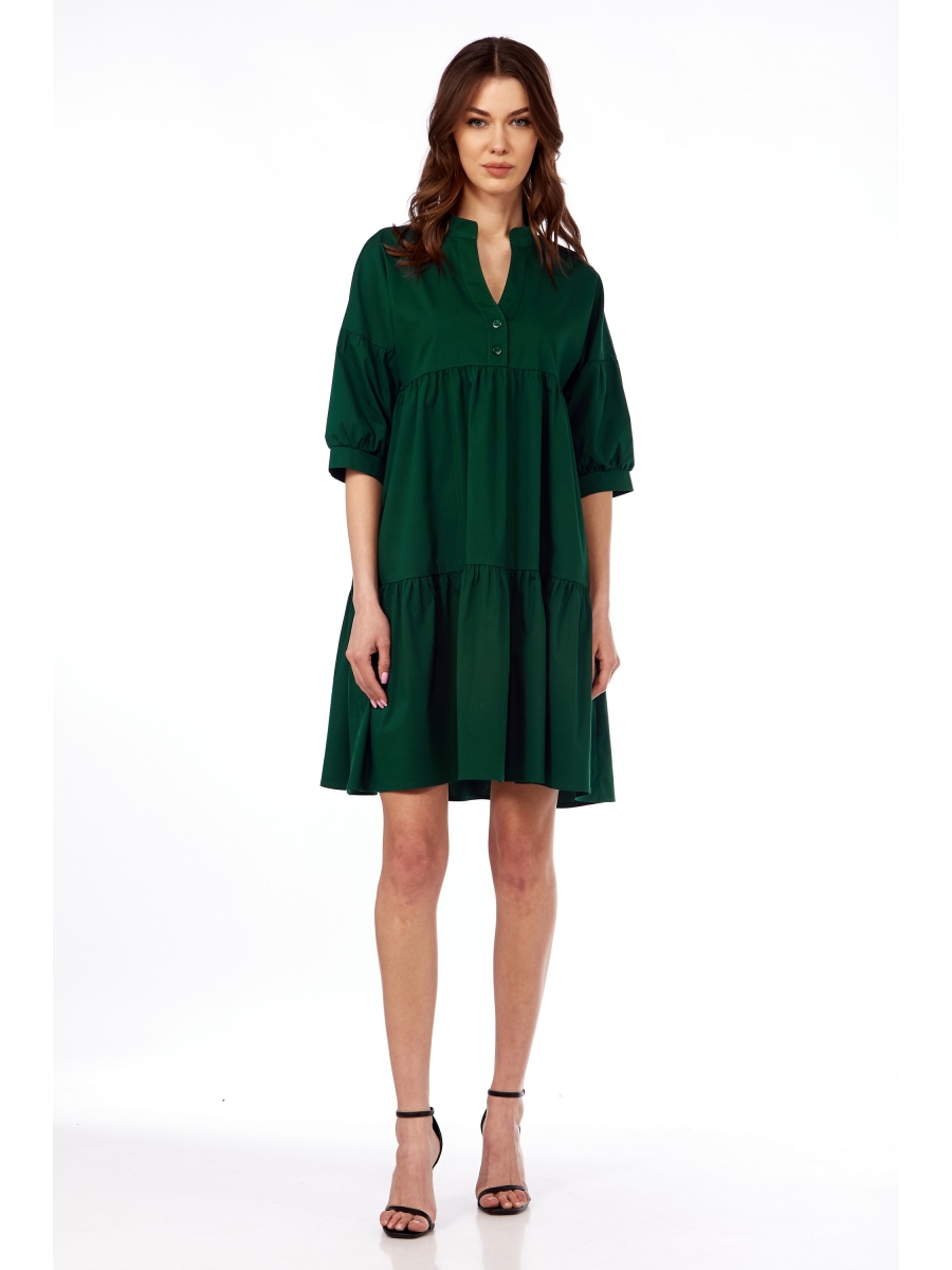 Платье женское, свободного силуэта, с застежкой на две пуговицы в верхней части переда. Передняя и задняя часть платья с двумя отрезами и мелкой сборкой по всему изделию, в боковых швах карманы. В верхней части переда отделочная планка. Горловина со стойкой. Плечо спущенное, рукав с мелкой сборкой в верхней и нижней части с приталенной манжетой.