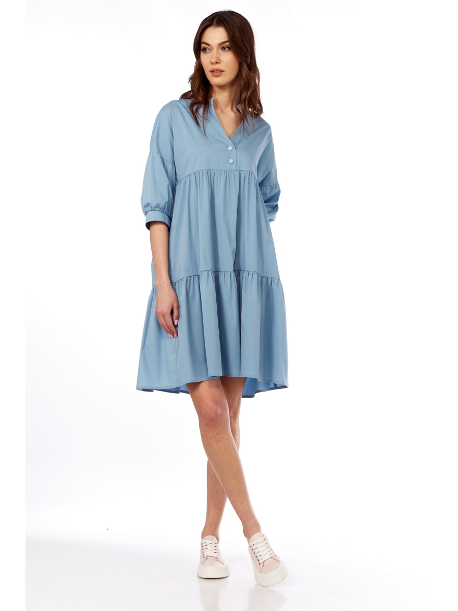 Оформить заказ →Платье женское, свободного силуэта, с застежкой на две пуговицы в верхней части переда. Передняя и задняя часть платья с двумя отрезами и мелкой сборкой по всему изделию, в боковых швах карманы. В верхней части переда отделочная планка. Горловина со стойкой. Плечо спущенное, рукав с мелкой сборкой в верхней и нижней части с приталенной манжетой.