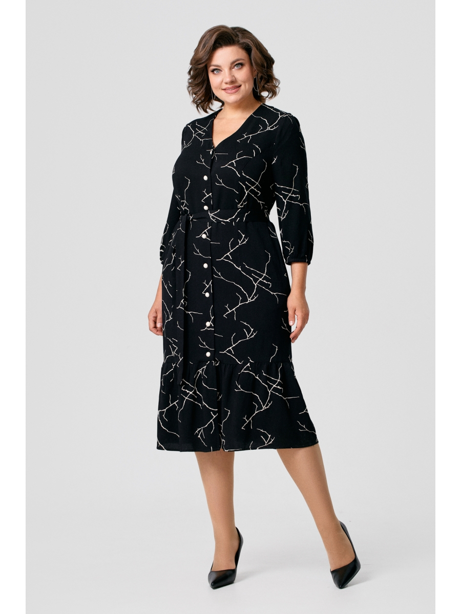 Классическое женское платье полуприлегающего силуэта из мягкой приятной к телу непросвечивающейся натуральной вискозы. Платье с V-образным вырезом горловины и втачными рукавами на резинке по низу застегивается на петли и пуговицы. По низу изделия отрезной валан с небольшой сборкой.