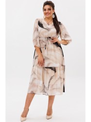 Погрузитесь в мир элегантности и утонченности с этим потрясающим платьем А-силуэта. Его изысканный V-образный вырез нежно обрамляет шею, придавая образу особую грацию и шарм. Рукава длиной 3/4, выполненные с легким расширением к низу, добавляют воздушности и романтики, а резинка на рукавах обеспечивает комфорт и свободу движений.