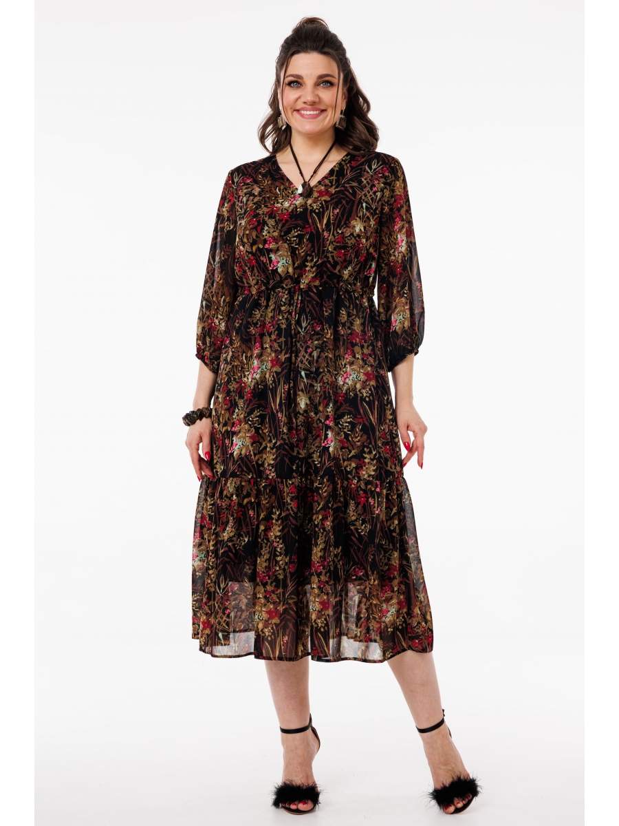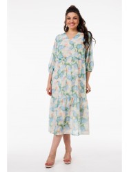 Погрузитесь в мир элегантности и утонченности с этим потрясающим платьем А-силуэта. Его изысканный V-образный вырез нежно обрамляет шею, придавая образу особую грацию и шарм. Рукава длиной 3/4, выполненные с легким расширением к низу, добавляют воздушности и романтики, а резинка на рукавах обеспечивает комфорт и свободу движений.