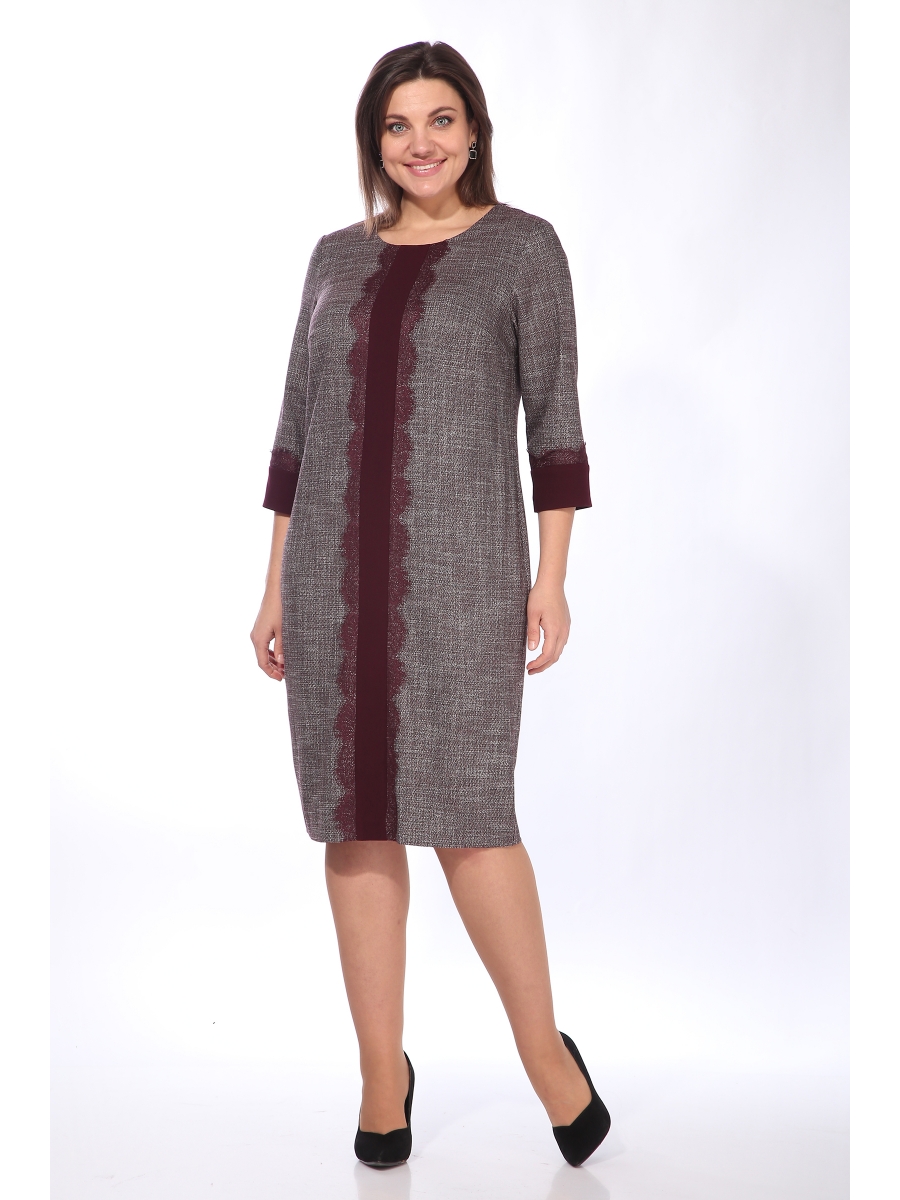 Платье женское, прямого силуэта. С круглым вырезом горловины. Из текстильного полотна. Перед платья с нагрудными вытачками, отделочной деталью по центру, с кружевом. Спинка со средним швом. Рукава втачные, одношовные, длиной 3/4. Низ рукавов с притачными манжетами, с кружевом.