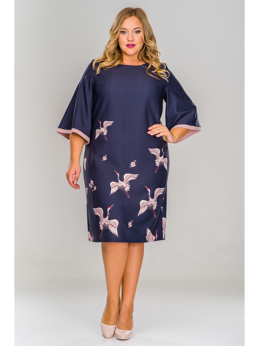 Платье полуприлегающего силуэта из крепа с эластаном. Принт журавли. Рукав расширенный, по низу рукава отделка цвета сомон шириной 2 см.