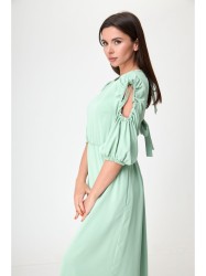 Это платье — сама нежность, воплощенная в струящихся оттенках весенней мяты и лазурного неба. Его прямой силуэт мягко обволакивает фигуру, создавая ощущение невесомости, а удлиненный крой придает образу особую поэтичность и грацию.