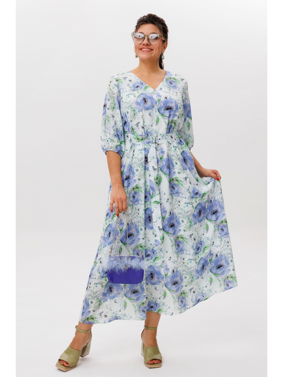 Белая основа платья, чистая и свежая, словно летнее облако, украшена россыпью голубых цветов льна — будто отражение луговых васильков в прозрачном ручье. Это платье в цвете «льняное утро» — воплощение легкости и очарования, созданное для тех, кто ценит гармонию простоты и природной красоты.