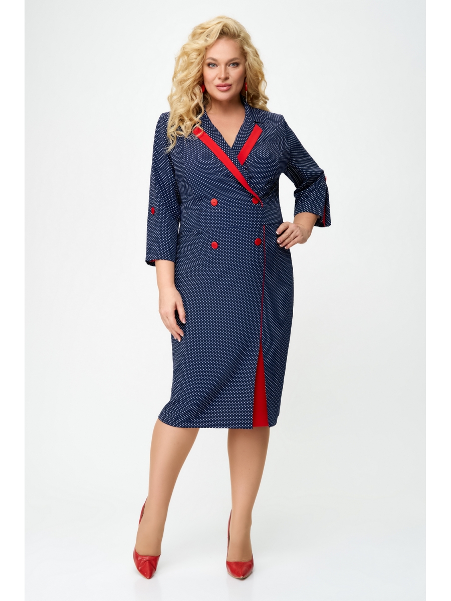 Платье женское полуприлегающего силуэта, с имитацией двубортной застежки, с пиджачным воротником. Перед отрезной по линии талии. Верхняя часть с рельефами от плечевого шва, нижняя часть с талиевыми вытачками, встречной складкой. Спинка со средним швом, по низу шлица. Рукав втачной, длиной ¾, из двух частей по низу встречная складка.