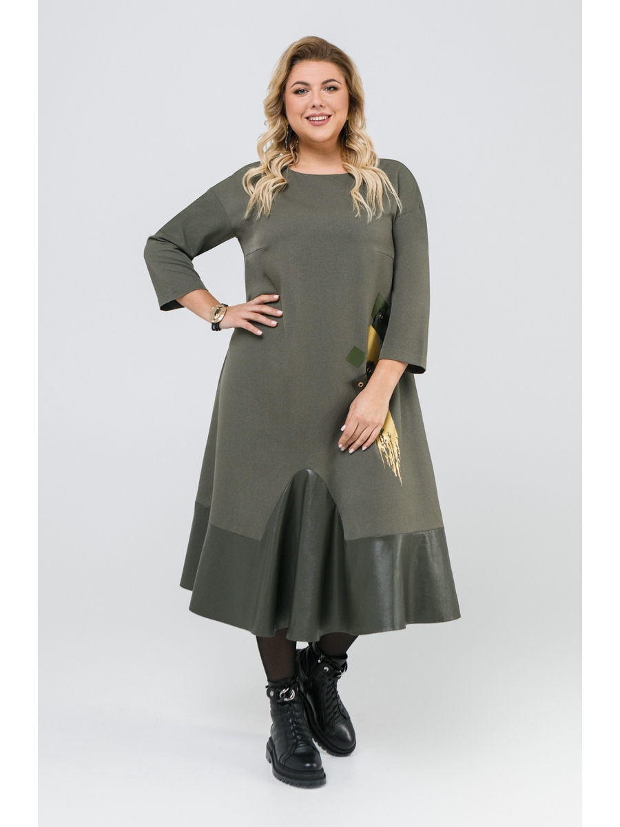 Женское платье расширенного к низу силуэта, выполненное из ткани костюмно-плательного ассортимента, отделкой служит эко-кожа. Из эко-кожи выполнен широкий волан по низу платья с фигурной линией притачивания. По переду справа в области бедер есть крупная печать с дополнительной отделкой из квадратных кусочков эко-кожи, которые крепятся к детали переда с помощью сквозных люверсов. Вырез горловины округлый. Рукав втачной со спущенной линией плеча.