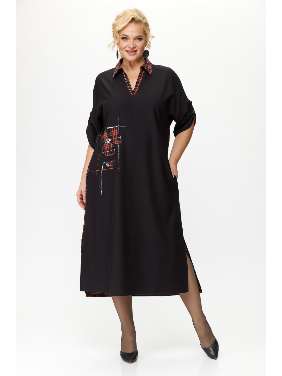 Универсальное платье в стиле «casual». Изделие выполнено из двух скомпонованных материалов — однотона и клетки. Перед и спинка цельнокроеные, спинка длиннее переда. Горловина с рубашечным воротником и V-образным вырезом. Плечо спущенное, рукав втачной длиной 3/4, застегивающийся на пату и пуговицу. По верху спинки имеется стачная встречная складка, благодаря которой имеется небольшое клешение. По переду платье украшено вышивкой из пайеток. В боковых швах имеются карманы, а также боковые разрезы. Изделие может сочетаться как с кедами, лоферами, так и туфлями. Универсальность и практичность платья сделают его любимым в Вашем гардеробе в наступающем осеннем сезоне.