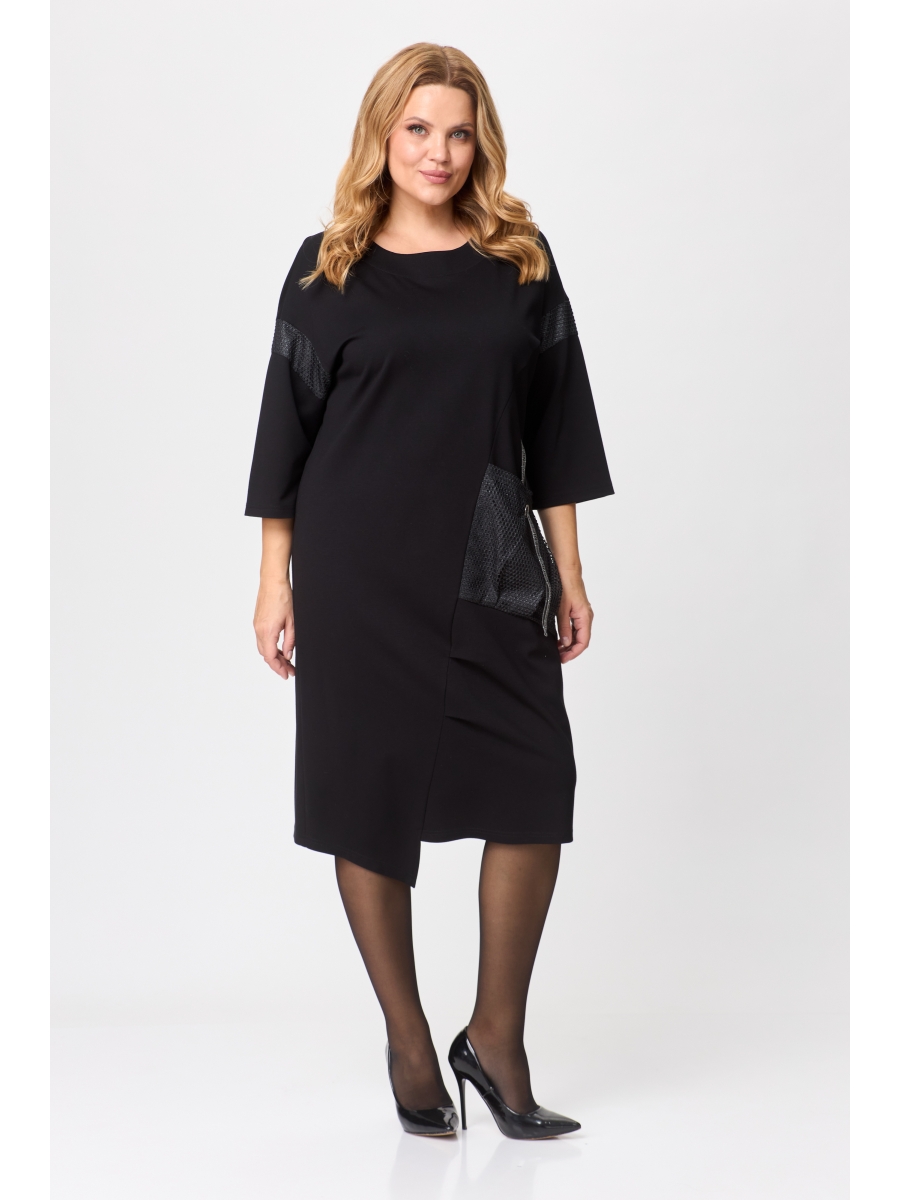 Универсальное трикотажное платье из трикотажа станет идеальным и интересным изделием для создания повседневного образа, походов в офис, а также на торжественные мероприятия. Платье прямого полуприталленного силуэта, длиной до линии колен. Изделие имеет ассиметричный перед - один косой рельеф и низ. Вырез горловины круглый, рукав втачной 7/8, спинка с центральным швом. В качестве декора по верху рукава и карман по переду изделия выполнен со вставками из отделочного материала и сетки; карман с люверсом и продетой через него тесьмой.