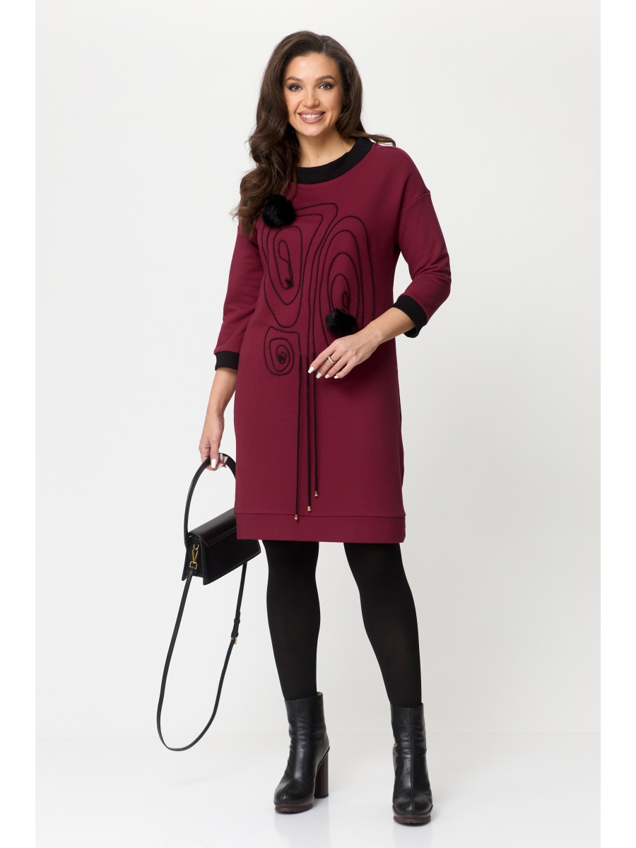 Женское трикотажное платье выполнено из футера 3-х нитка, для повседневной носки станет одним из базовых и любимых изделий в Вашем гардеробе. Платье прямого полуприлегающего силуэта, длиной до колена, однотонное с контрастными манжетами из довяза и планкой горловины. Вырез горловины круглый, рукав втачной длиной 3/4. Украшением платья служит контрасная вышивка из шнура и пристегивающиеся меховые пушки.