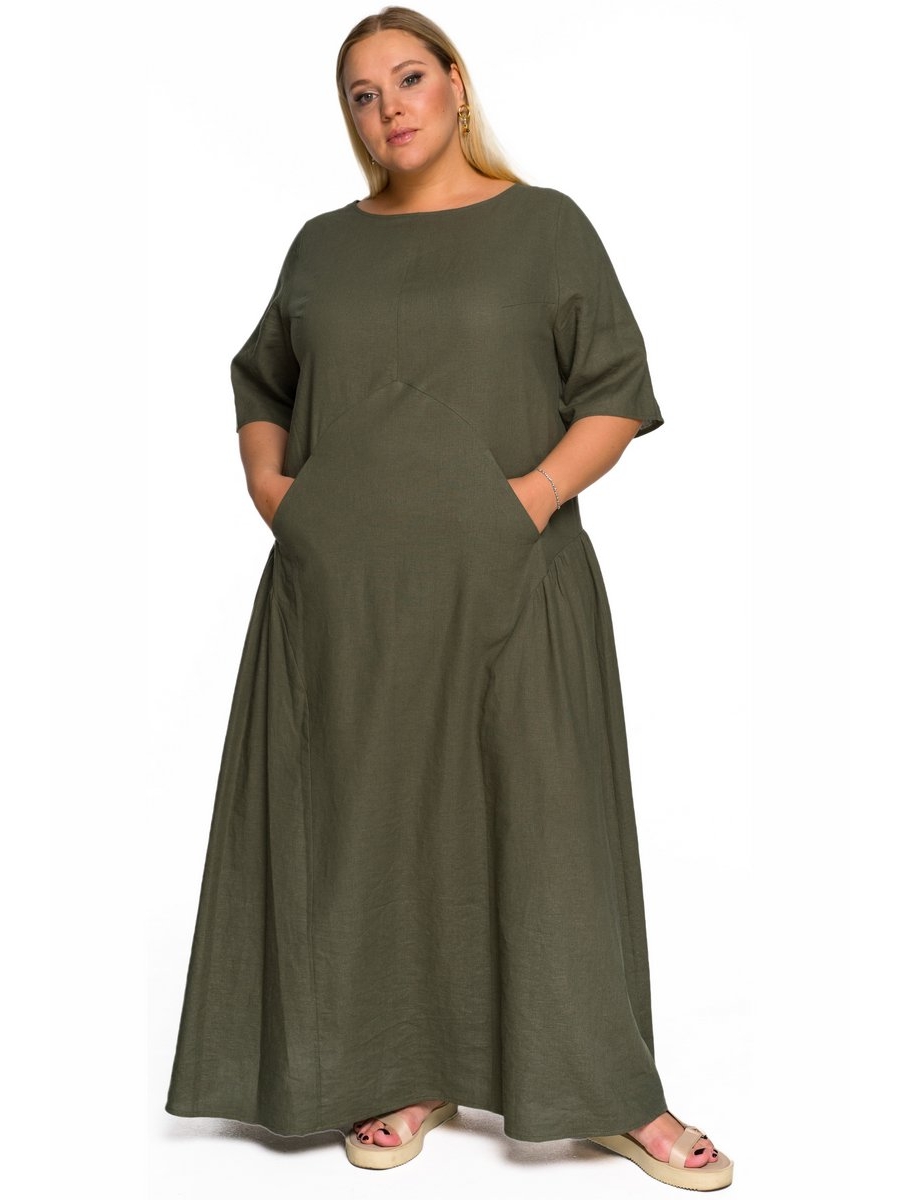 Платье длинное, свободного силуэта, из смесовой ткани, содержащей в составе лен и вискозу. Нижняя часть платья отрезная, присборенная. Линия подреза по переду фигурная, по спинке горизонтальная. В швам подреза обработаны карманы. Рукав втачной, свободный.