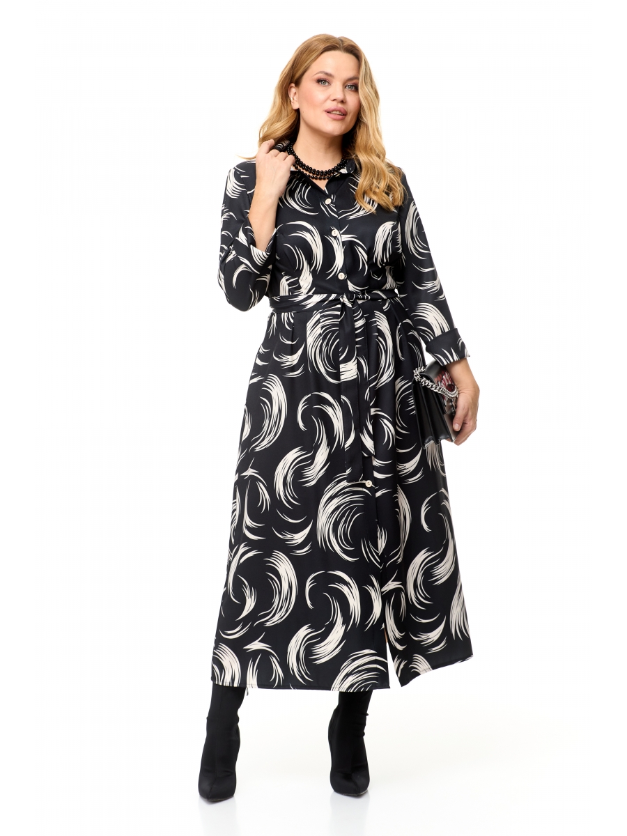 Очень стильное женское платье. Идеально как для офиса и как нарядная моделька. Платье цельнокроенное, не отрезное по линии талии с защипами спереди и сзади с поясом в цвет ткани. Воротник стойка, рукав с отворотами при желании можно опустить. Спереди платье на пуговичках.