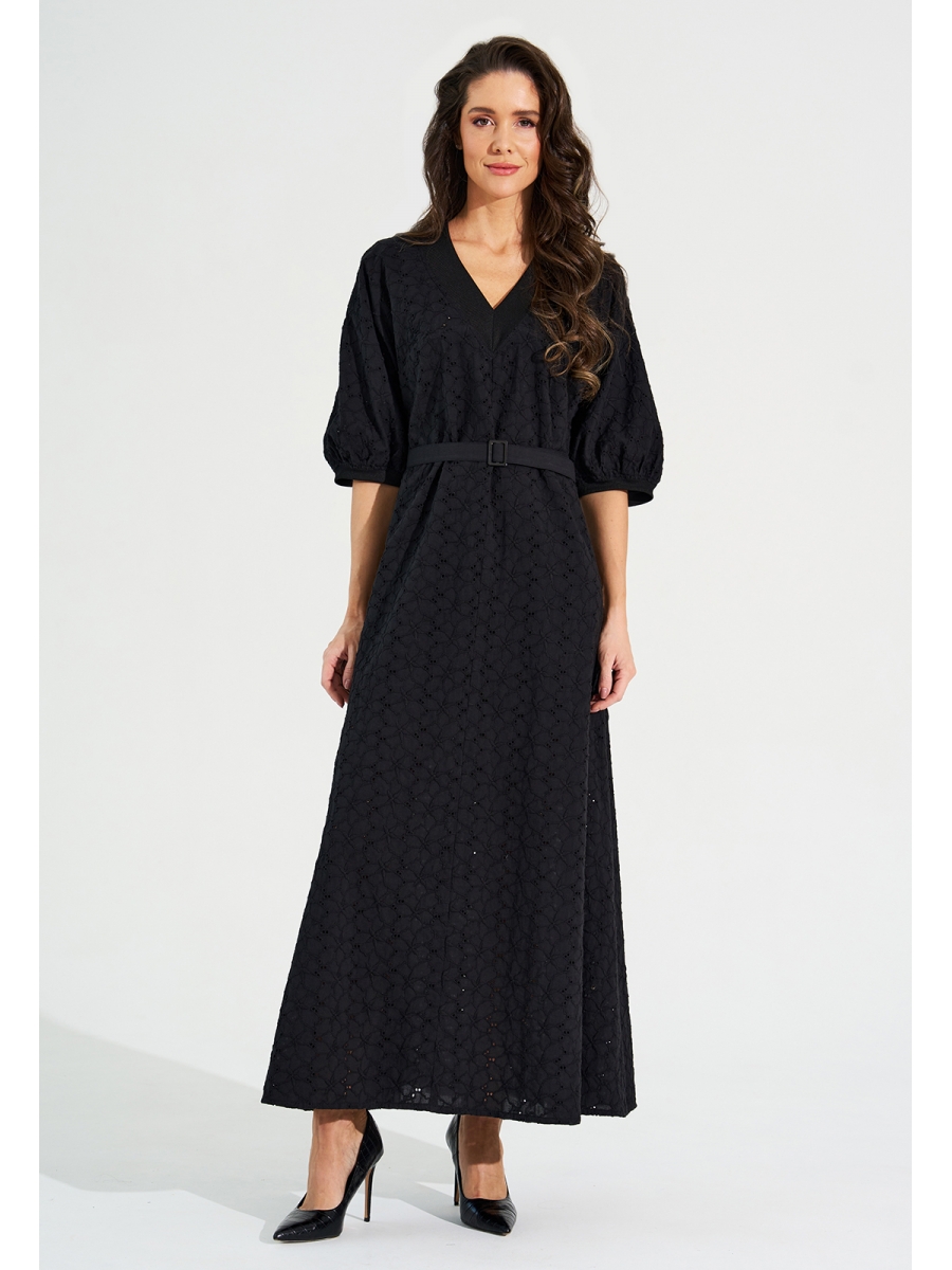 Платье струящегося силуэта из натуральной дышащей ткани «шитье» скрывает все недостатки, зрительно вытягивая фигуру. В этой модели все продумано для абсолютной уверенности в себе – подкладка платья изготовлена из ткани-компаньона, а рукава заканчиваются на уровне локтя, полностью закрывая плечо. Платье можно носить как с поясом, так и без, поэтому он закреплен временной строчкой.