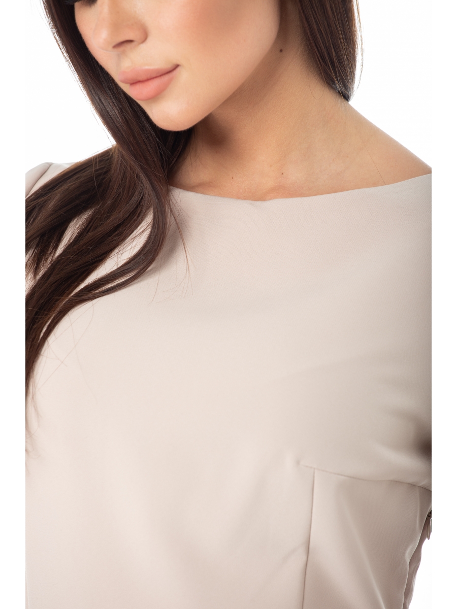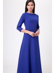 Рукава втачные, длиной 3/4. Вырез горловины – элегантная лодочка. Дополняется съемным поясом в тон платья.