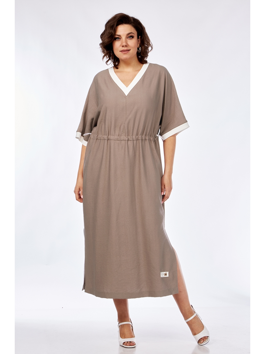 Платье женское, свободного силуэта, изготовлено из плательной ткани. Горловина V-образной формы. По низу рукавов и горловине мягкий довяз. Рукава - цельнокроеные. В платье по талии обработана кулиса, в которую втянут шнур-резинка с фиксаторами. В изделии обработаны косые карманы. По низу в боковых швах разрезы. Декоративный элемент - нашивка.