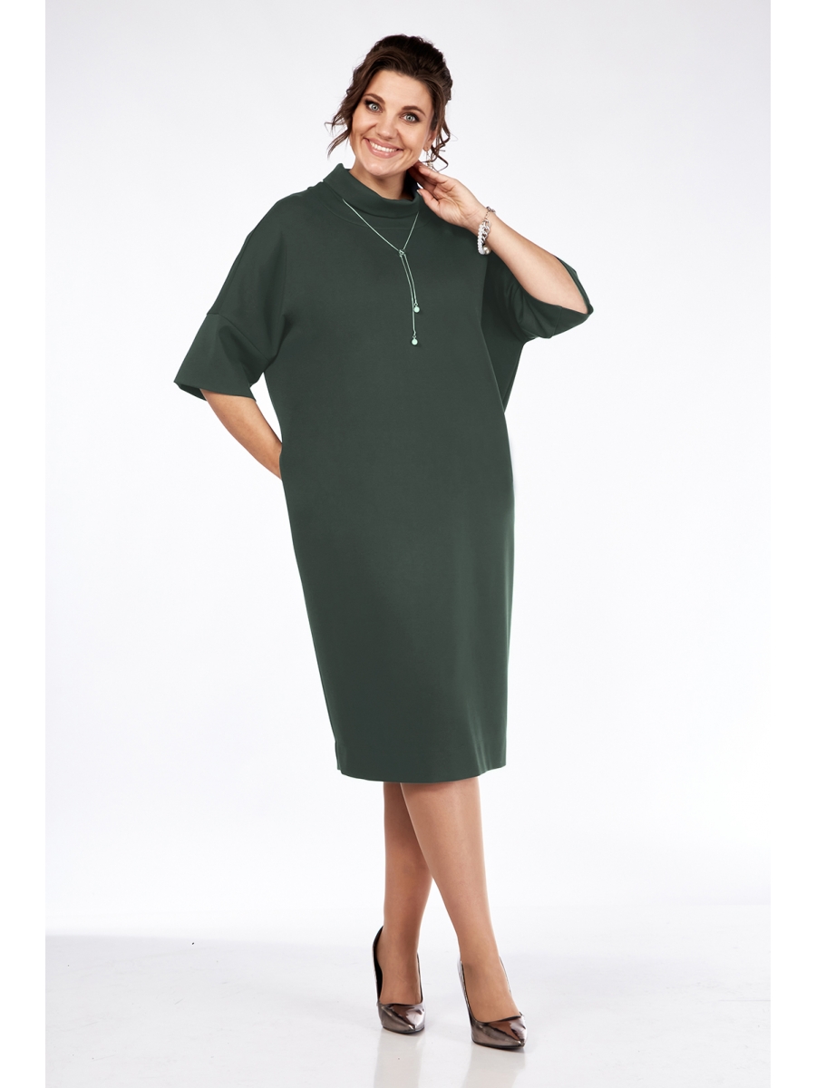 Платье женское, свободного силуэта изготовлено из трикотажного полотна. Горловина с отрезной деталью обработана воротником - стойкой. Рукав спущенный. В боковых швах обработаны карманы. В комплекте съемная подвеска.