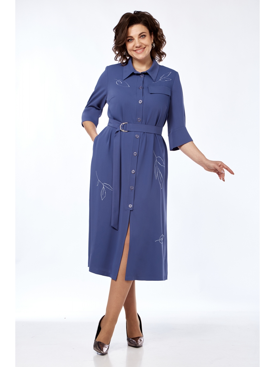 Платье женское, А-силуэта выполнено из плательной ткани. Воротник рубашечного типа, застежка центральная, фигурная планка на петли и пуговицы. Перед с нагрудными вытачками и ассиметричным клапаном в области груди. Спинка со средним швом. Рукава втачные со складками и притачной манжетой. Пояс выполнен из основной ткани с пряжкой. Платье декорировано дизайнерской вышивкой.