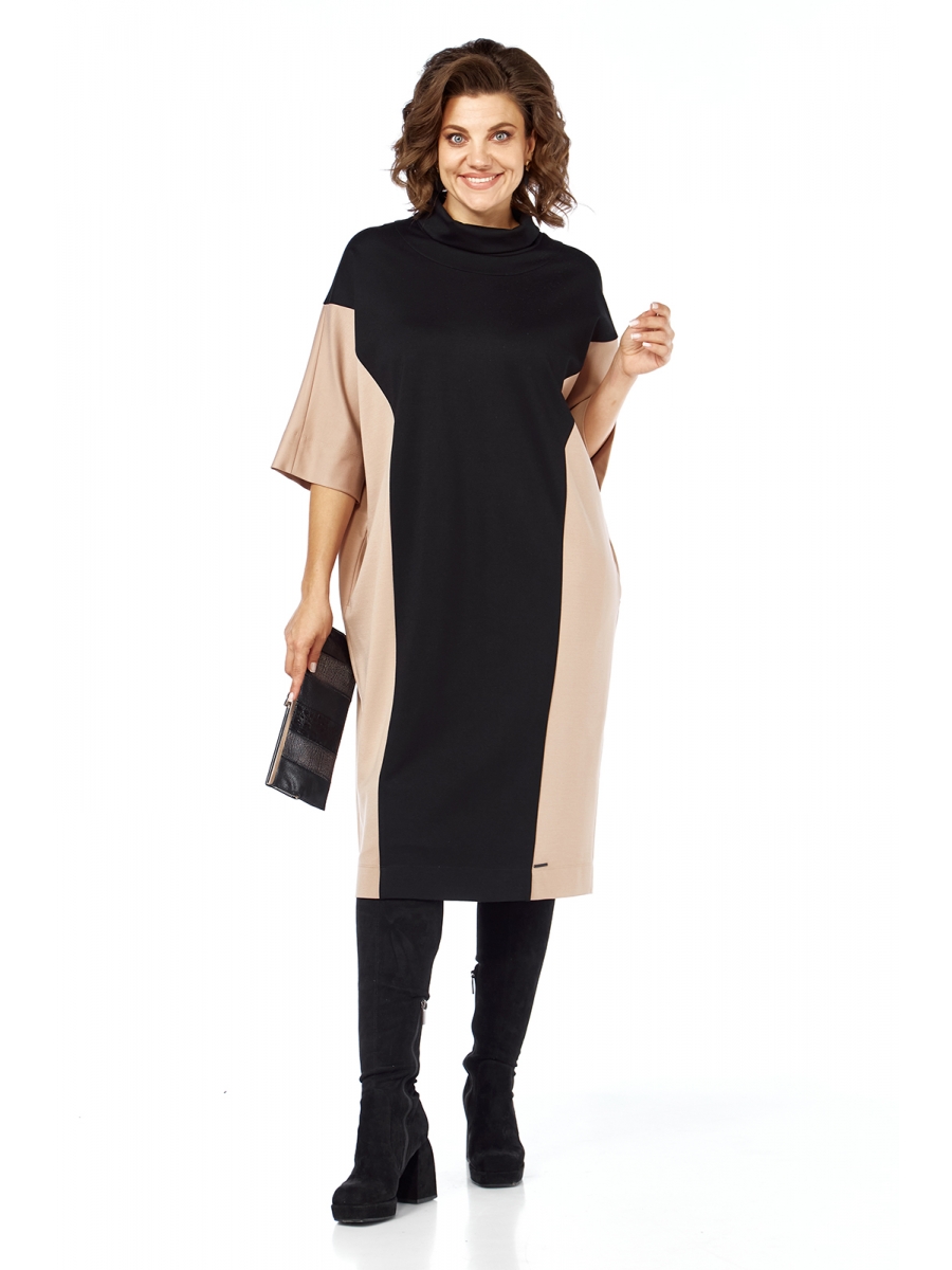 Платье женское свободного силуэта, выполнено путем комбинирования тканей двух цветов, из трикотажного полотна. Изделие с воротником “хомут”. По переду и спинке обработаны фигурные рельефы. Рукава спущенные. В боковых швах имеются карманы.