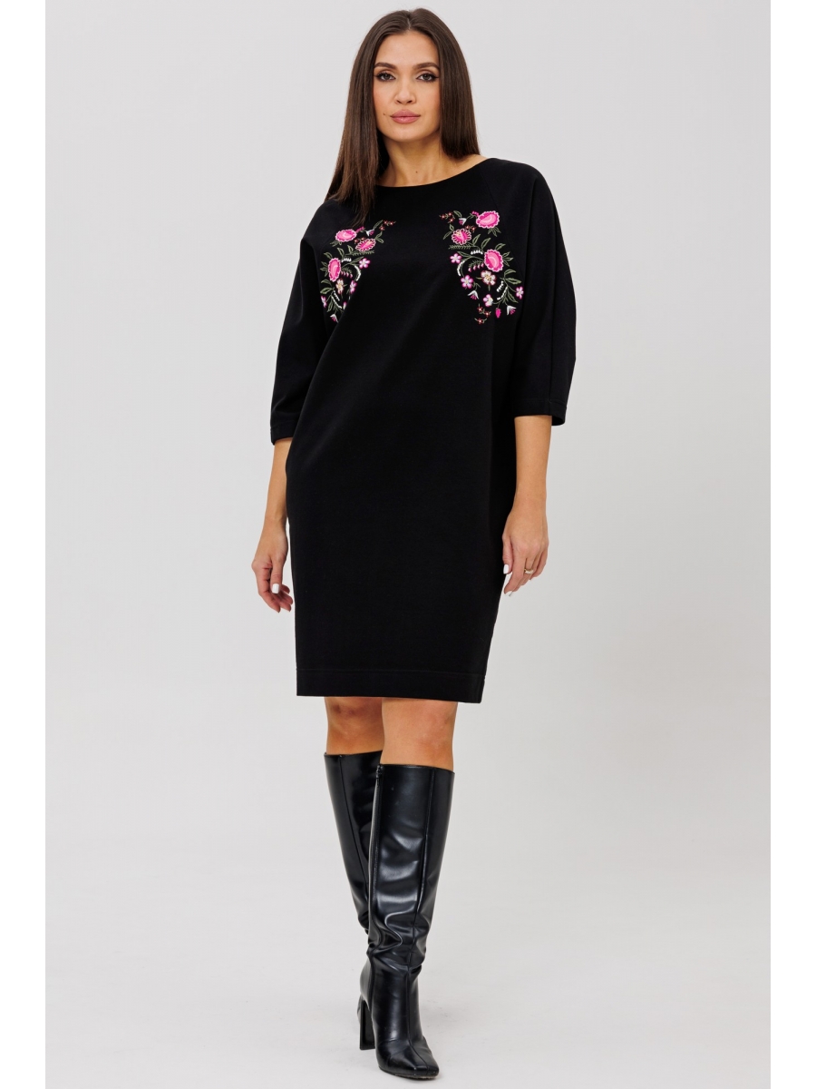 Перед цельный с декоративной дизайнерской вышивкой. Горловина - лодочка, обработана обтачкой. Спинка со средним швом. Рукав полуреглан.