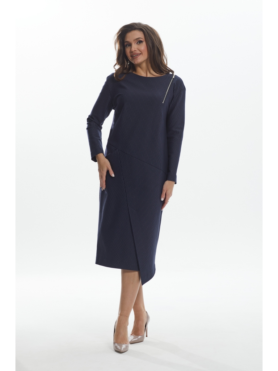 Платье женской свободного силуэта зауженной книзу. Спинка со средним швом. По переду подрез ниже линии талии и подрез по левой нижней стороне, переходящий в шлицу. Слева из линии плеча декоративная молния. Линия низа по переду фигурная. Платье без подкладки