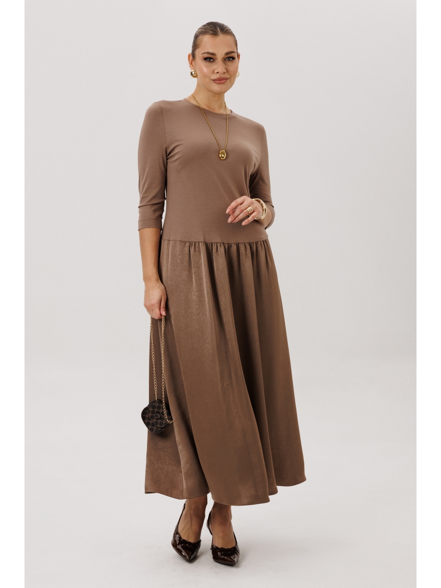 Свободный силуэт, втачной покрой, круглая горловина с эффектной каплей на спине. Верх платья - из мягкого трикотажа, низ - из невероятного вискозного крэшевого полотна.
