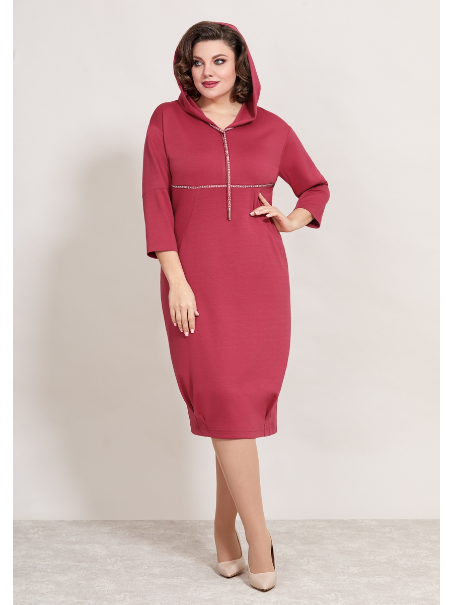 Женское платье в спортивном стиле, полуприлегающего силуэта, выполнено из трикотажного полотна. Горловина платья обработана капюшоном и застежкой на молнию. Лиф платья отрезной ниже линии груди и декорирован тесьмой, такая же тесьма вставлена в капюшон. На юбке платья выполнены подрезы с карманами, что придает платью функциональности. По низу юбки обработаны выточки, что создает силуэтность платья, спинка также с горизонтальным подрезом, средним швом и вытачками, по низу платья, в среднем шве вставлена молния. Рукав втачной, на спущенной пройме, оптимальной длины.