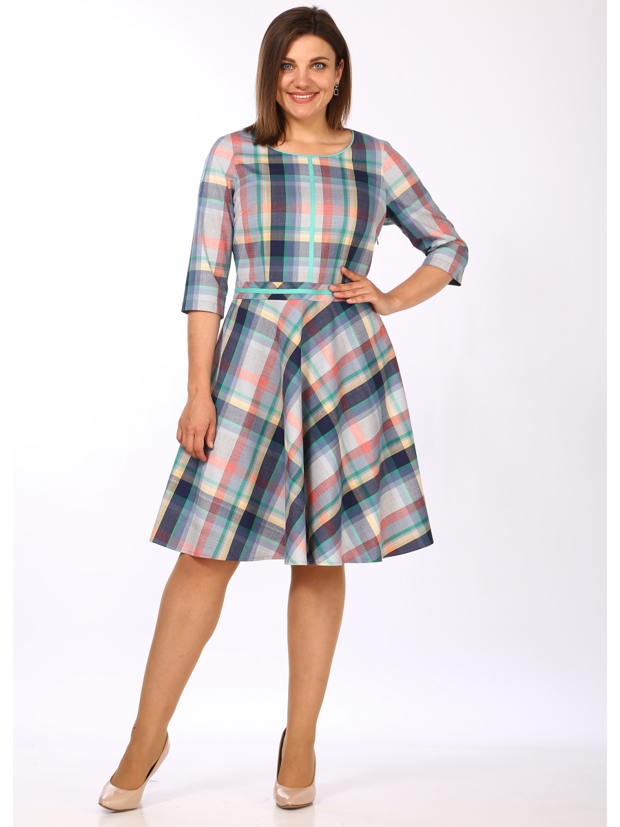 Платье женское прилегающего силуэта по лифу и расклешенное понизу. Платье отрезное по линии талии. Рукава втачные, одношовные.