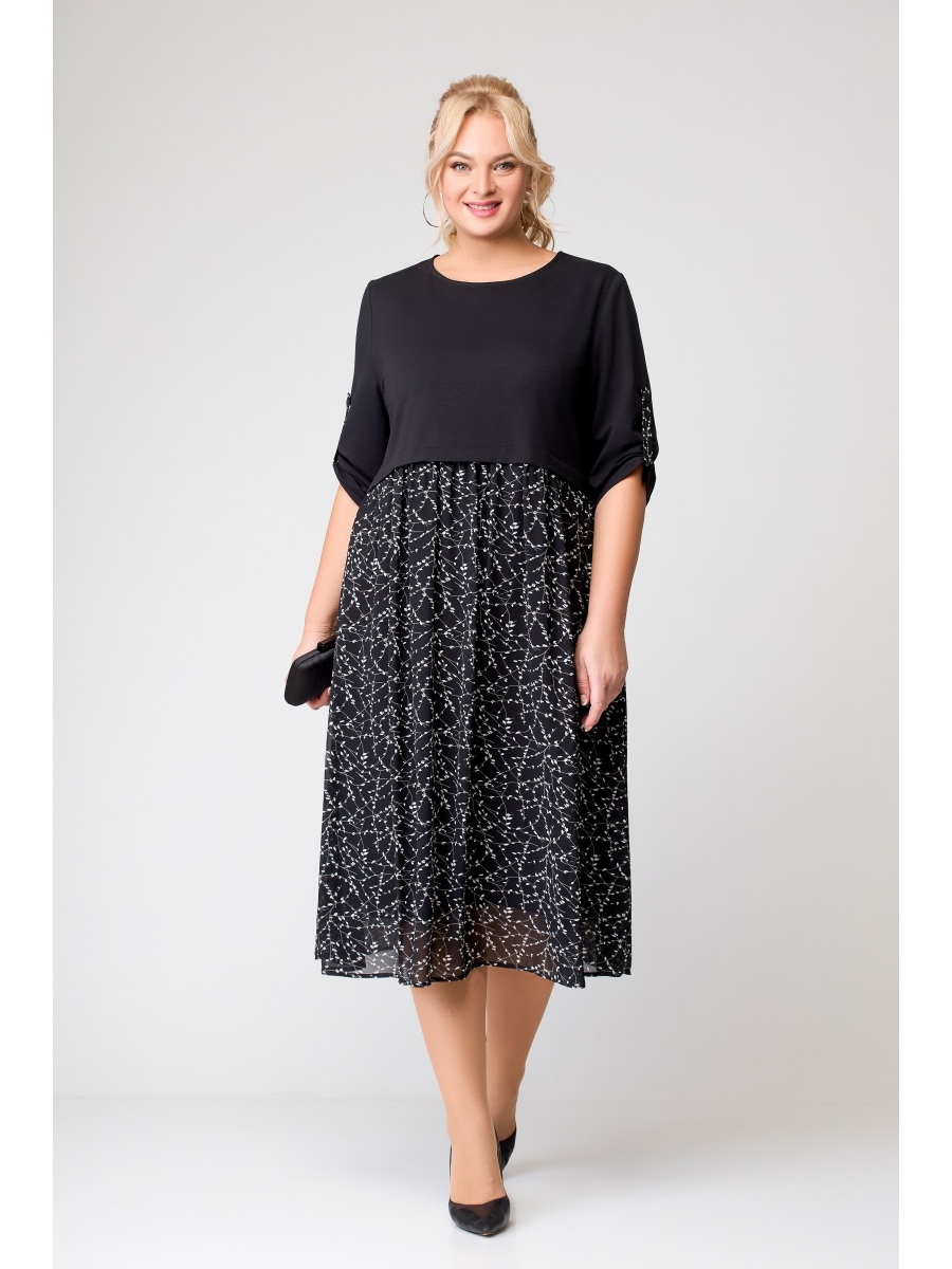 Платье женское полуприлегающего силуэта, выполнено комбинированием двух видов ткани - футера 2- нитки и шифона. Платье с круглой горловиной. Рукав ¾, который регулируется по высоте патой, застёгивающейся на петлю и пуговицу. Платье отрезное по линии талии, с декоративным напуском на юбку платья. Перед и спинка лифа платья цельные, также как и рукава выполнены из футера 2-нитки. Юбка платья, на трикотажной подкладке, выполнена из шифона.