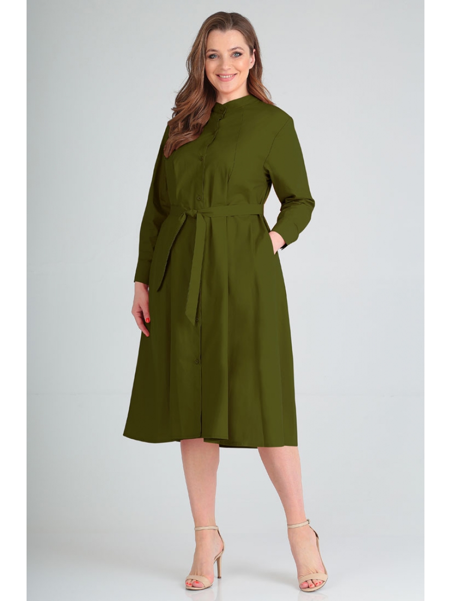 Модное платье свободного силуэта, расширенное к низу, фиксируется по талии поясом из основной ткани. Застежка центральная на планку, цельнокроеную с полочкой. Воротник стойка, с закругленным верхним краем. Рукав втачной, одношовный с притачным манжетом, длина рукава -3/4 (52 см).