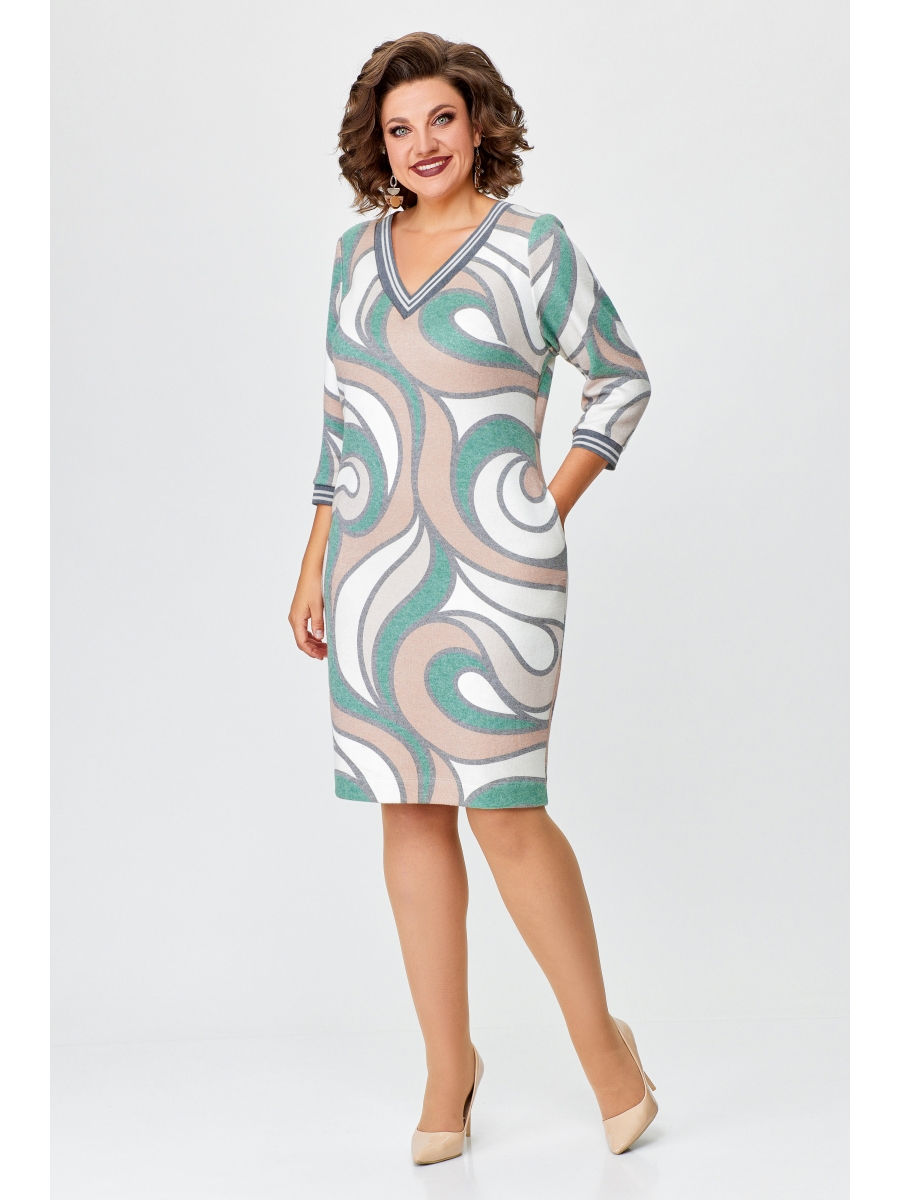 Платье из эластичного трикотажного полотна полуприлегающего силуэта. По переду обработаны нагрудные вытачки. Спинка цельнокроеная. Рукав втачной одношовный длиной 4/5 с манжетой из декоративного трикотажного довяза. В боковых швах обработаны карманы. Горловина V-оборазной формы, обработана декоративным трикотажным довязом.