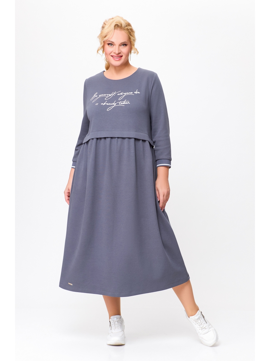 Платье женское полуприлегающего силуэта из голландского хлопкового трикотажного полотна. Платье отрезное по линии талии, с декоративным напуском на юбку платья. Перед и спинка лифа цельнокроеные. Юбка платья со сборкой по верхнему срезу и карманами в боковых швах. Горловина округлой формы, обработана хлопковой бейкой. Рукав втачной одношовный с манжетой из декоративного довяза. По переду лифа расположена декоративная печать-надпись. Перевод текста: «Будь собой; все другие роли уже заняты».