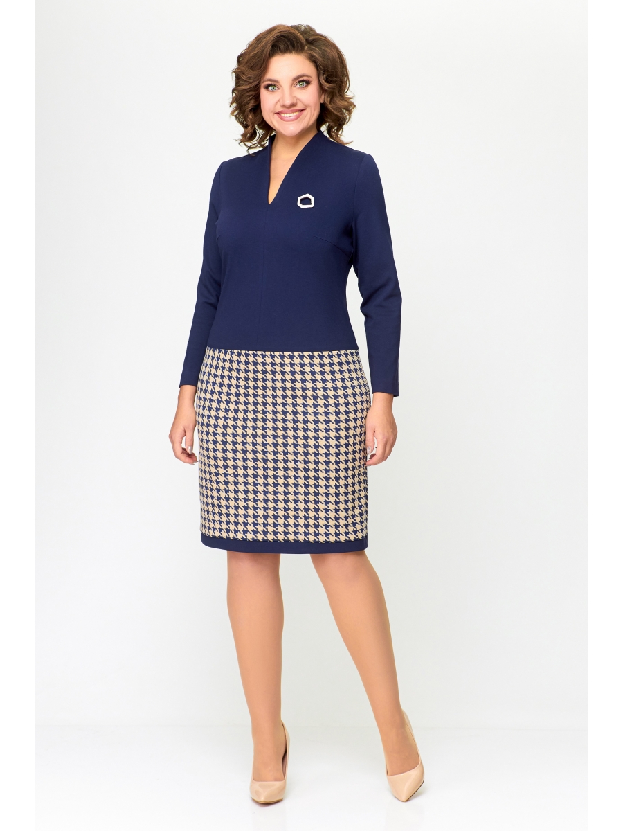 Платье отрезное ниже линии талии. Верхняя часть выполнена из однотонного полотна, нижняя часть - с дизайном «гусиная лапка». Передняя часть лифа со средним швом и нагрудными вытачками. Спинка лифа со средним швом и талиевыми вытачками. По горловине спинки обработана притачная стойка высотой 3 см, плавно переходящая в V-образный вырез по переду, обработанный обтачкой.