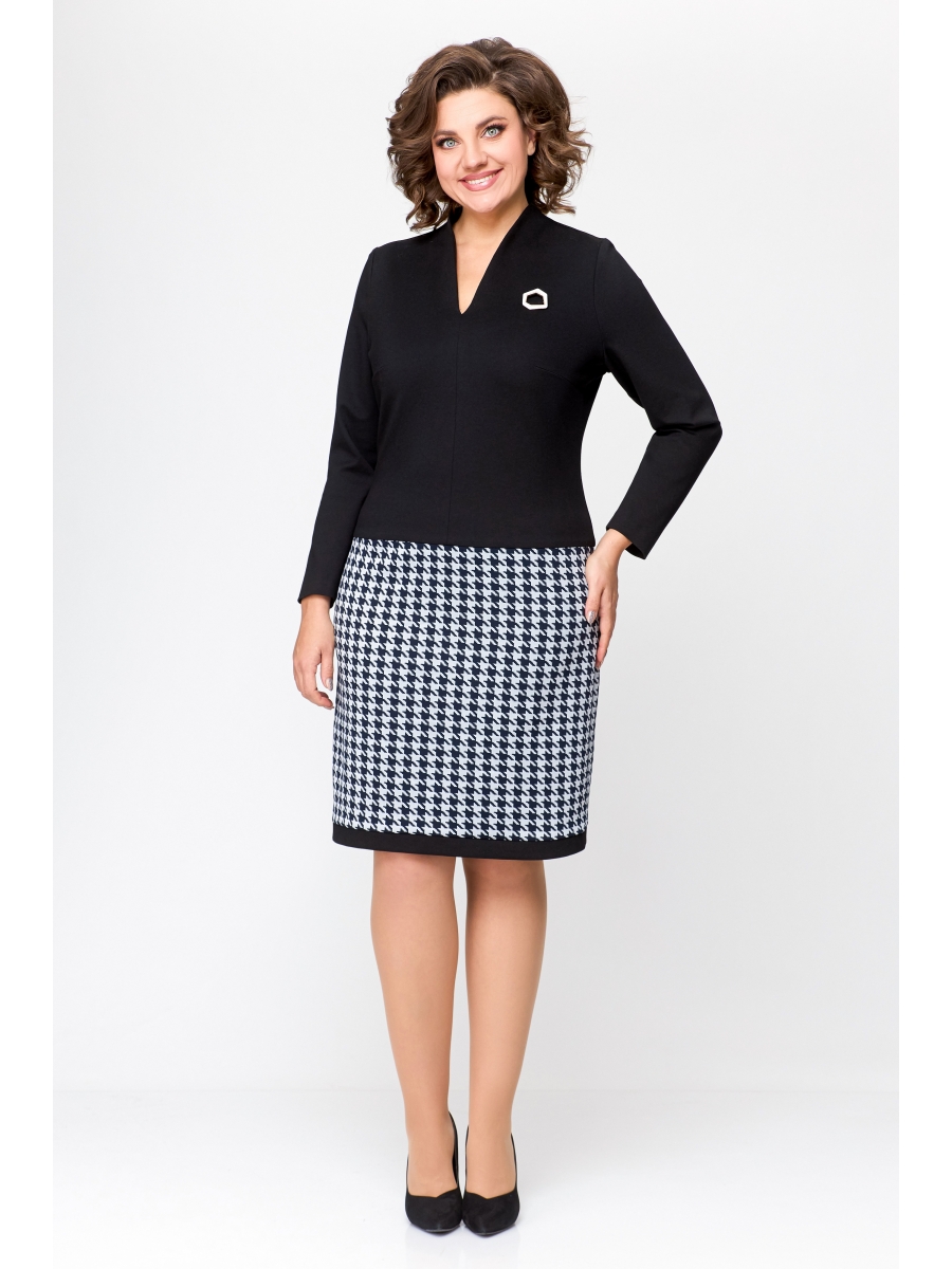 Платье отрезное ниже линии талии. Верхняя часть выполнена из однотонного полотна, нижняя часть - с дизайном «гусиная лапка». Передняя часть лифа со средним швом и нагрудными вытачками. Спинка лифа со средним швом и талиевыми вытачками. По горловиле спинки обработана притачная стойка высотой 3 см, плавно переходящая в V-образный вырез по переду, обработанный обтачкой.
