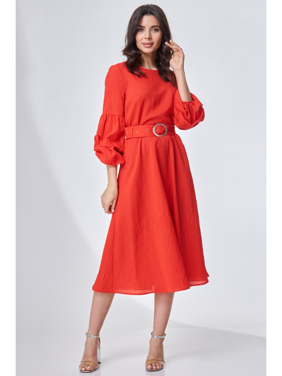 Платье из жатой ткани полуприлегающего силуэта, расклешенное книзу. Вырез горловины округлой формы. Платье отрезное по линии талии. По переду обработаны нагрудные вытачки. Спинка с застежкой молнией в среднем шве. Рукав втачной длинный, на резинке понизу, с горизонтальным подрезом и с защипами. Пояс из основной ткани с пряжкой.