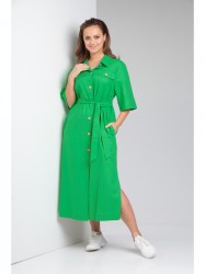 Женское платье свободного покроя из однотонного льна. По переду центральная застежка на петли-пуговицы. Нагрудные вытачки из бокового шва, кокетка выше уровня груди с отделочными клапанами. Спинка цельная, кокетка. В боковых швах функциональные карманы и разрезы. Воротник рубашечного типа на стойке. Рукав втачной со спущенной линией плеча.