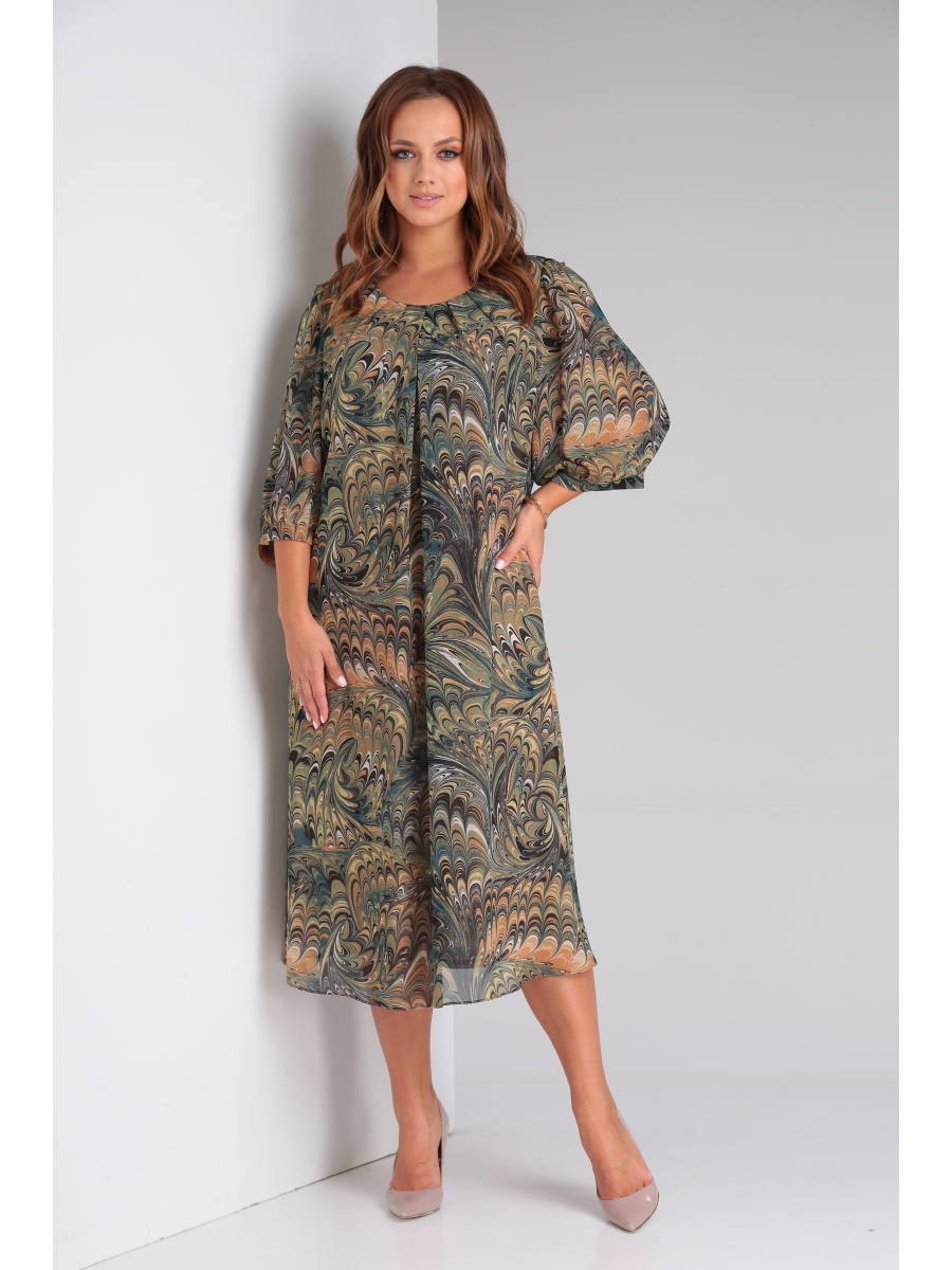 Платье женское нарядное свободного покроя из плательно-блузочной ткани шифон, на подкладке. По переду цельное, декорировано складками по горловине. По спинке средний шов. Горловина округлой формы, обработана обтачкой. Рукав втачной 3/4 со сборкой по окату и низу.