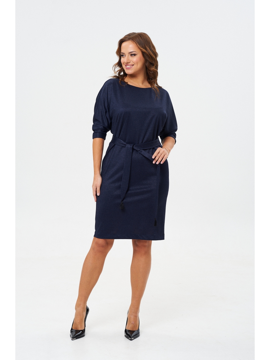 Платье прямого силуэта, выполнено из трикотажного полотна с легким мерцанием (блеском). Рукав цельнокроеный, длина ¾. По переду платья нагрудные вытачки. Вырез горловины «лодочка». По спинке застежка-молния. Платье с поясом, на концах которого декоративные кисточки.