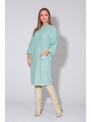 Платье прямого свободного силуэта выполнено из трикотажного полотна. Боковая часть платья покроена в другом направлении, тем самым рельефная линия вытягивает фигуру. Спереди большие накладные карманы с клапаном, который фиксируется пуговицей. Воротник-стойка. Линия плеча спущена. Рукав втачной, прямой.