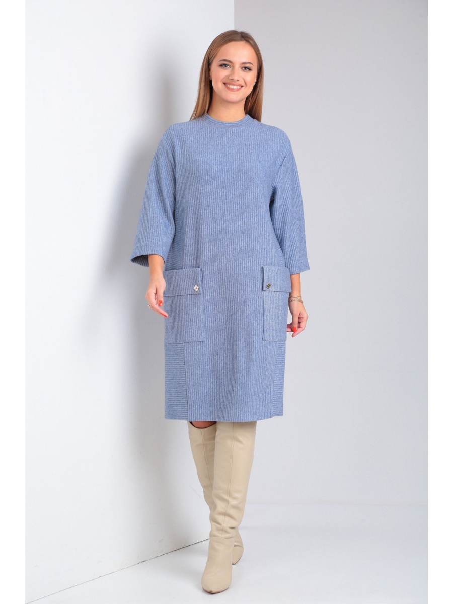 Платье прямого свободного силуэта выполнено из трикотажного полотна. Боковая часть платья покроена в другом направлении, тем самым рельефная линия вытягивает фигуру. Спереди большие накладные карманы с клапаном, который фиксируется пуговицей. Воротник-стойка. Линия плеча спущена. Рукав втачной, прямой.